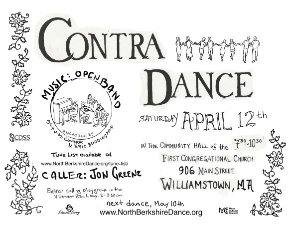 Tomorrow night, we’re having our usual cheerful, friendly second Saturday monthly contra dance in Williamstown. We do our best to be welcoming to new and experienced dancers alike.