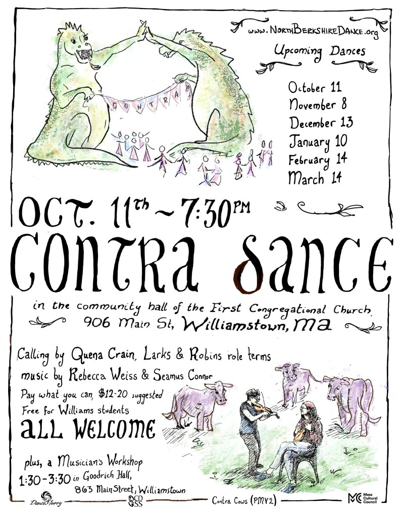 On Saturday, October 11th, Quena Crain will call for our community contra dance here in Williamstown. And we’ll have music by Rebecca Weiss on fiddle with Seamus Connor on guitar. We hope you can come!