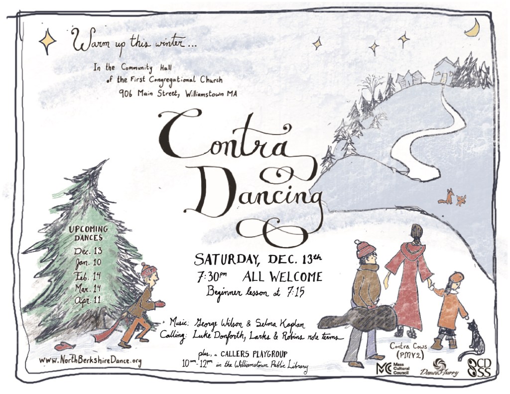 Come cheer up, and warm up, at a community contra dance, on Saturday, December 13th, in Williamstown, MA. We’ll have live music in the New England tradition by George Wilson and Selma Kaplan, and calling by Luke Donforth.