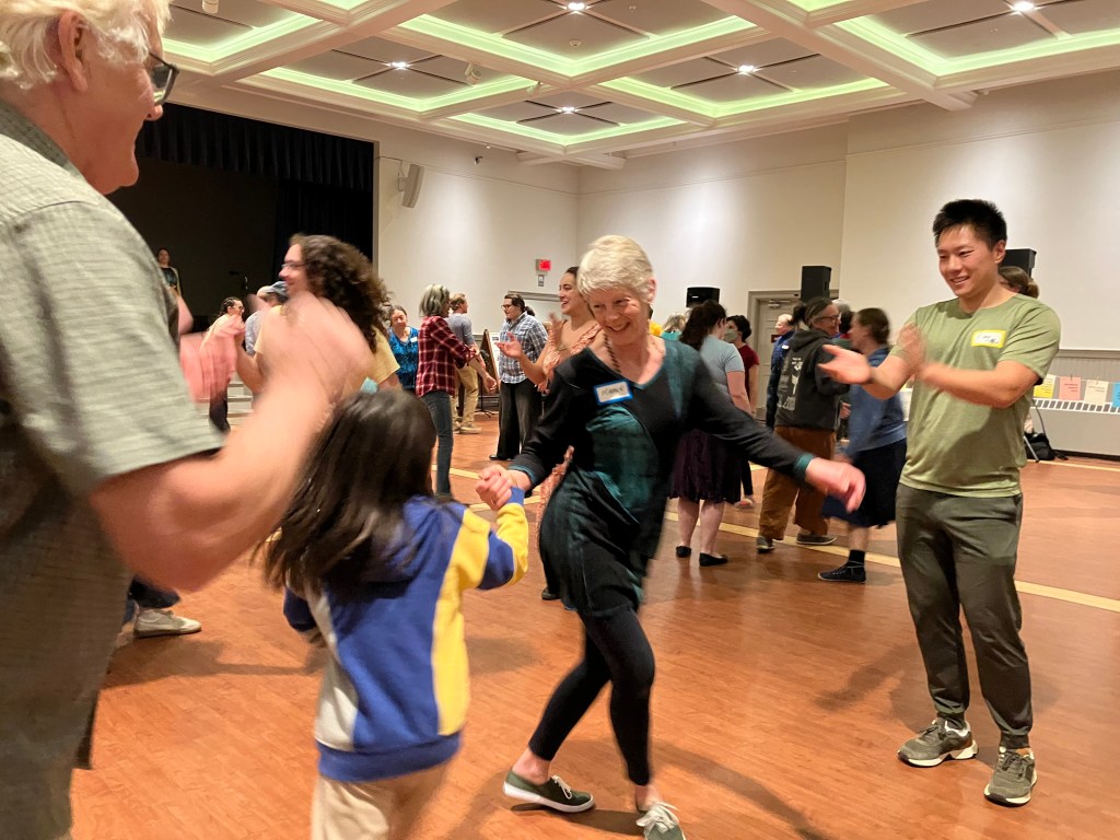 As a community contra dance in a small college town, we try to be welcoming to a wide range of people and abilities. Contra dancing is a group activity, perfect for meeting neighbors, making new friends, or just enjoying live music and a low stakes, pleasant social activity. Come alone or with friends – no need to bring a partner. In contra dancing it is usual to find a new partner for each dance within the evening, and you’ll end up dancing with everyone in the hall, more or less. Newcomers, and families with children, please do come for the introductory lesson at 7:15.